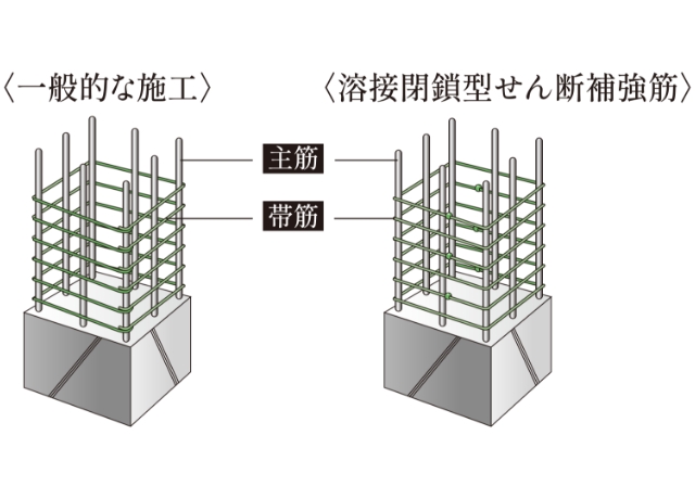 主要構造部(建築基準法第2条第五号)のコンクリート柱において、帯筋として継ぎ目を溶接した溶接閉鎖型の高性能なせん断補強筋を採用。一般的な帯筋に比べ、せん断力に対する補強効果が高く、柱の耐震性を向上させています。また、大きな地震の際に生ずる、大きな押しつぶしの力には、主筋のはみ出しを抑える役目を果たし、柱の抵抗力を高めます。